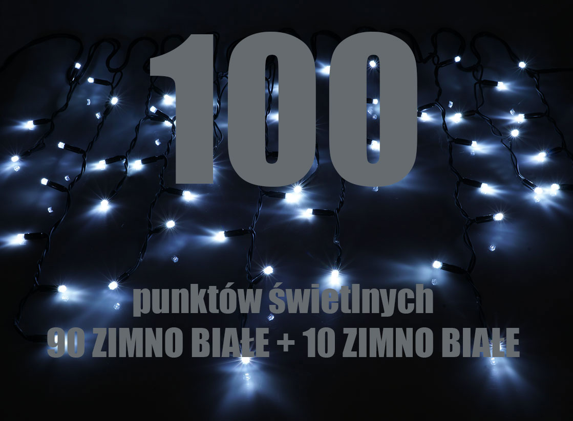 Lampki choinkowe sople LED zewnętrzne na czarnym przewodzie. Kurtyna idealnie sprawdzi się jako dekoracja okien, balkonów, witryn, elewacji czy też dachów oraz jako oświetlenie drzewek (choinek). Lampki są bardzo oszczędne, 100 punktów świetlnych to jedynie 6W poboru mocy. Komplety wyposażone są w dodatkowe gniazdo, które umożliwia połączenie ze sobą do 5-ciu zestawów, uzyskując w ten sposób aż 25m oświetlenia. Konstrukcja kompletu choinkowego gwarantuje bezpieczne długotrwałe użytkowanie.